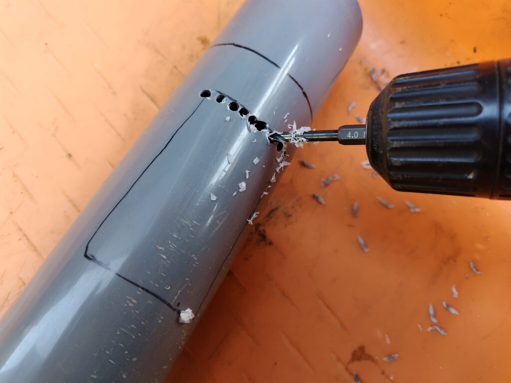 硬い塩ビパイプにカッターで切り込みを入れるより、ドリルで穴を開け、穴を繋いでしまうのが簡単そうです。