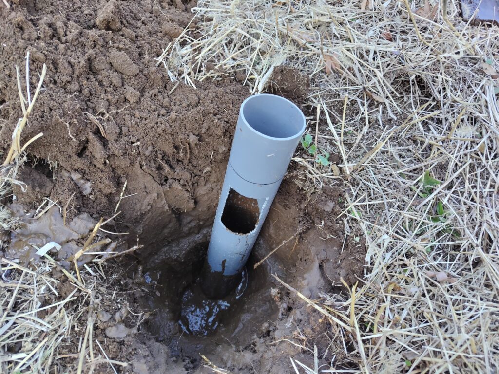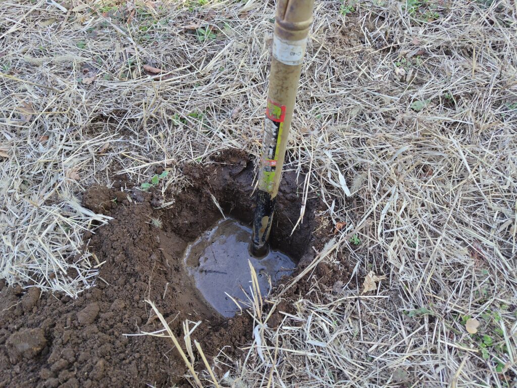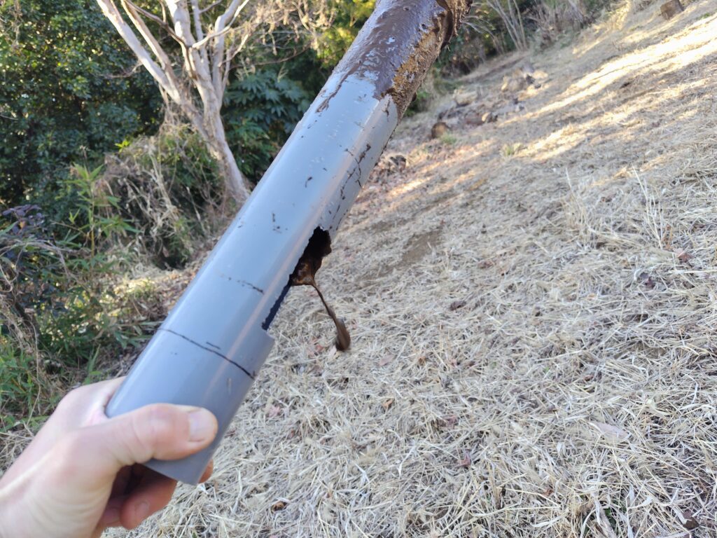 穴の底を小さなシャベルを取り付けた細い塩ビパイプで突き、穴を掘り進めます。